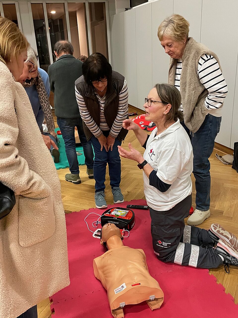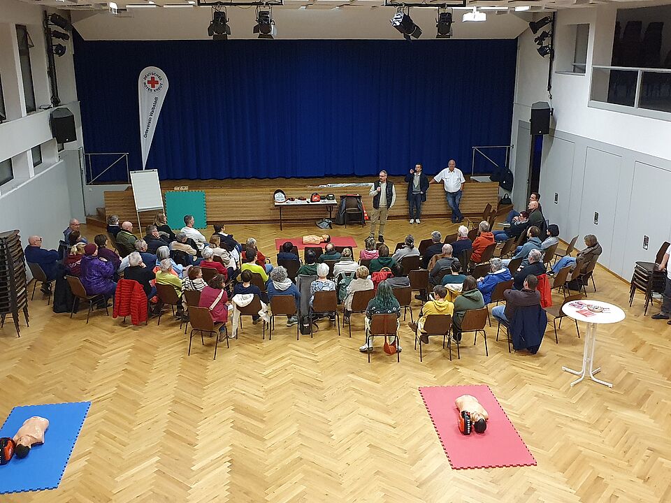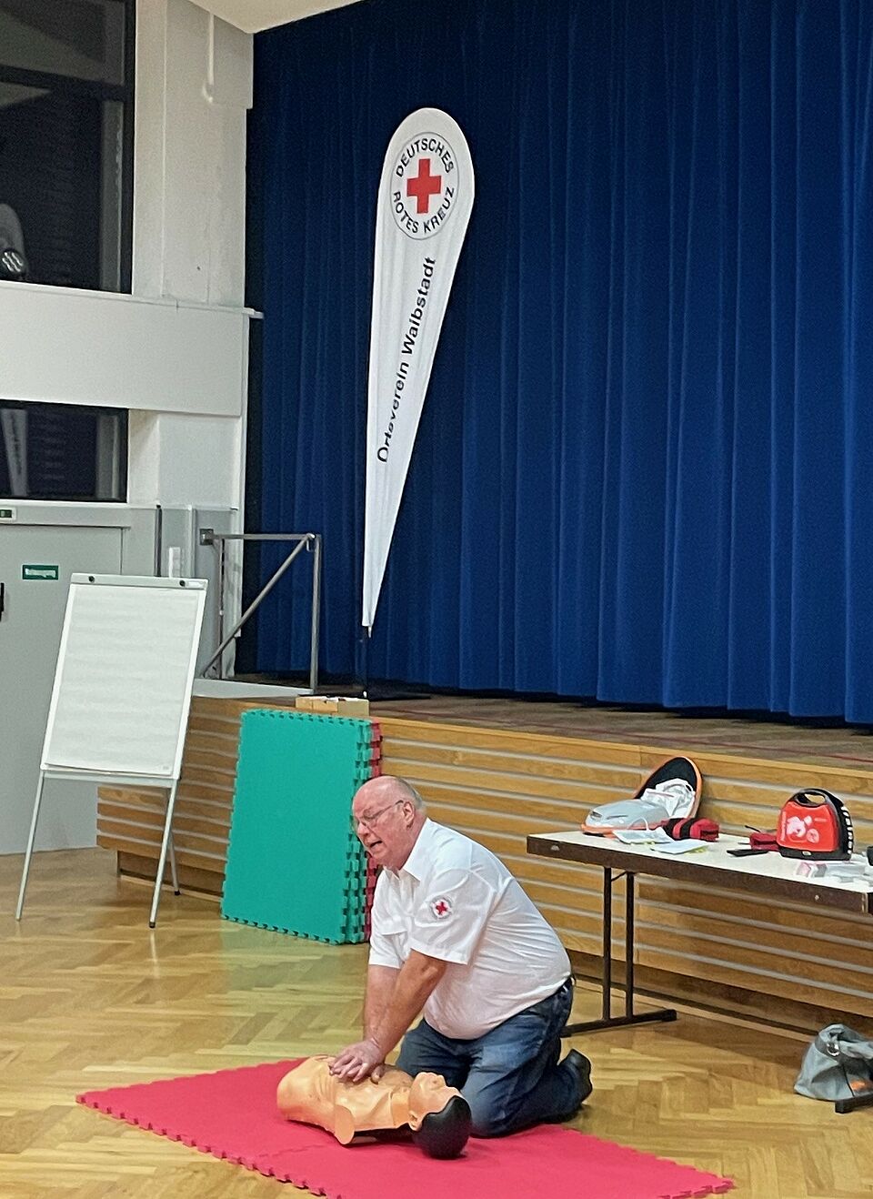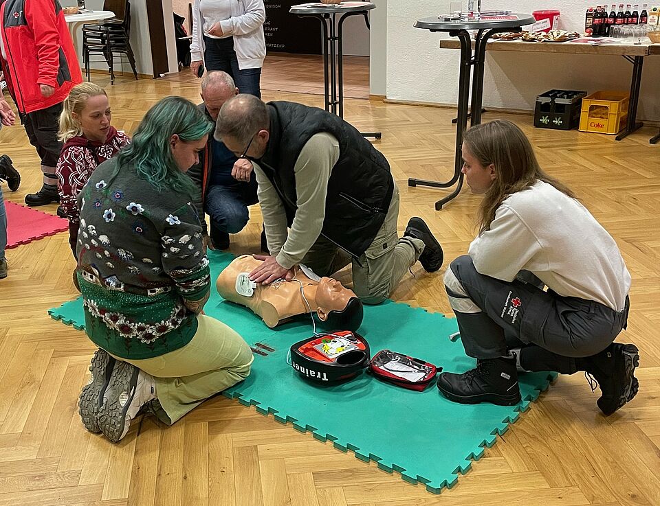 Die Zielsetzung des Abends war klar: Im Notfall sollen die Teilnehmer sofort mit der Herzdruckmassage beginnen können. Im Mittelpunkt der Veranstaltung stand die Wiederbelebung bei Herz-Kreislauf-Stillstand. Vermittelt wurde, wie Ersthelferinnen und -helfer richtig handeln. Und so erfuhren die Teilnehmer alles über die Herzdruckmassage bis zum Einsatz eines AED, also eines Defibrillators. In Waibstadt und Daisbach sind mehrere solche Geräte öffentlich zugänglich. Nach der Theorie wurde praktisch geübt. Die Teilnehmenden konnten das Gelernte an mehreren Stationen direkt anwenden und wurden dabei von den DRK-Mitgliedern angeleitet.